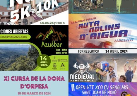Ruta Molins d'aigua LlucenaTrail TeresaTrail Azuébar10k y 5k Nules5k Cursa de la dona OrpesaTorreblanca Medieval Xtrem RaceOpen CV Btt Senglars Sant Joan de Moró15/04/2024 -